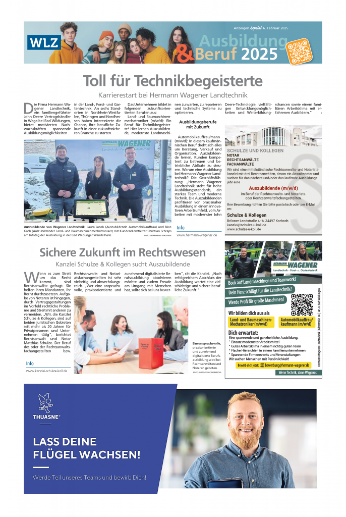 Beim Infotag der Ausbildung am 21.01.2025 haben unser Kundendienstleiter Christian Schraps, Auszubildende als Auomobilkauffrau Laura Jakob und Auszubildender als Land- und Baumaschinenmechatroniker Nico Koch das Unternehmen repräsentiert und jungen Leuten mehr über die Ausbildung bei uns erzählt. Ein entsprechender Artikel dazu ist am 06.02.2025 in der WLZ erschienen.