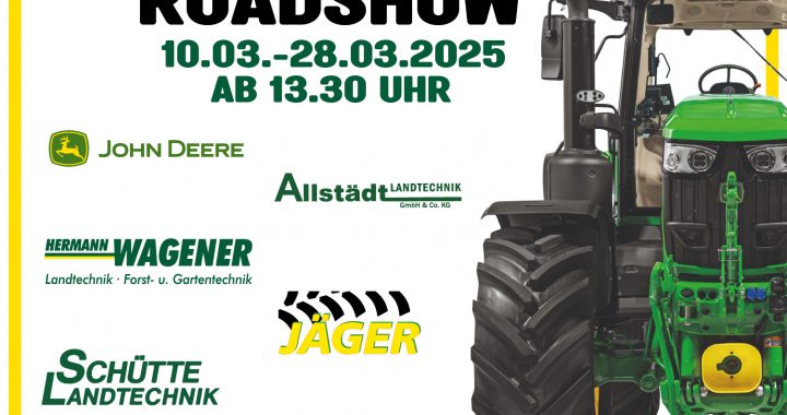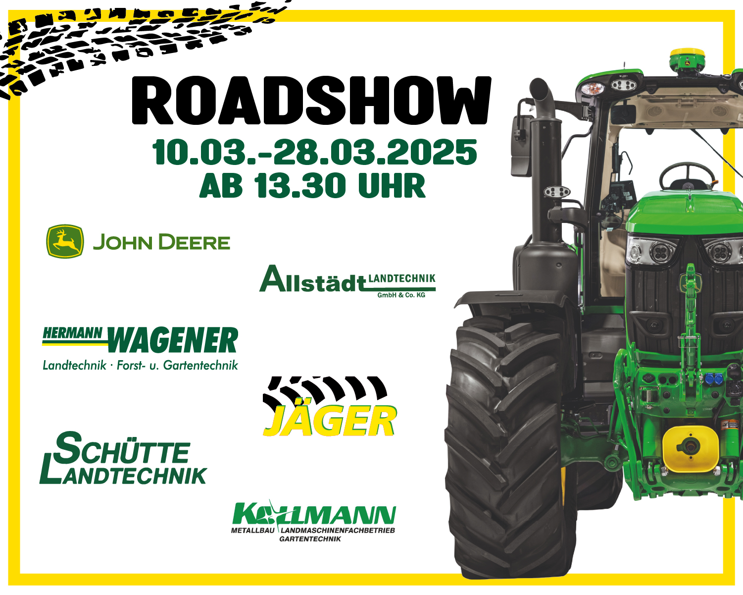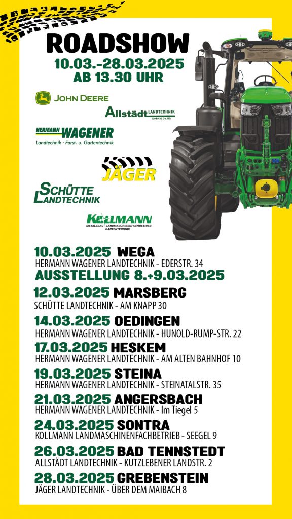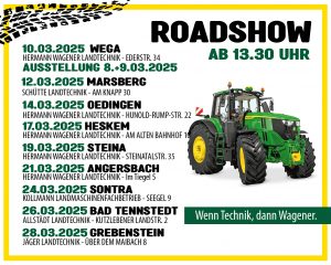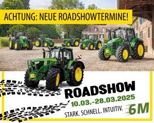 Sei dabei und steig ein, vom 10. bis 28. März 2025. Erlebe Landtechnik hautnah auf unserer Roadshow! Freu dich auf spannende Termine an all unseren Standorten und drei Partnerbetrieben.