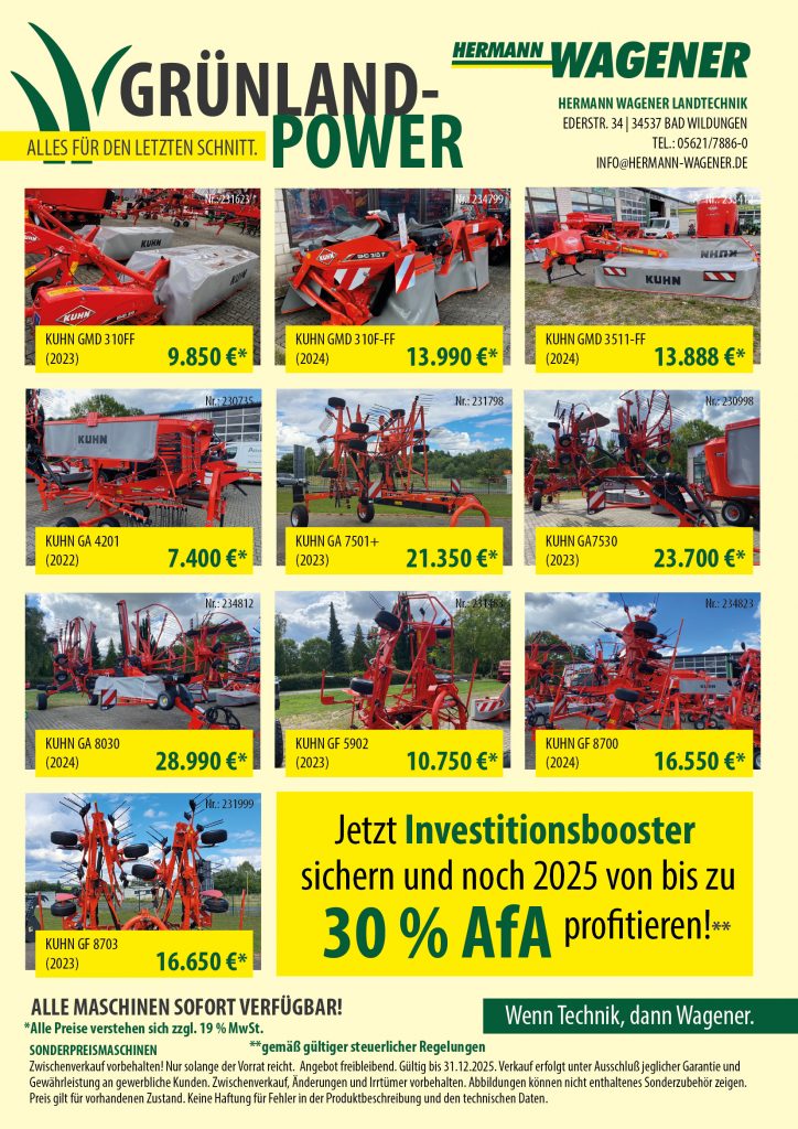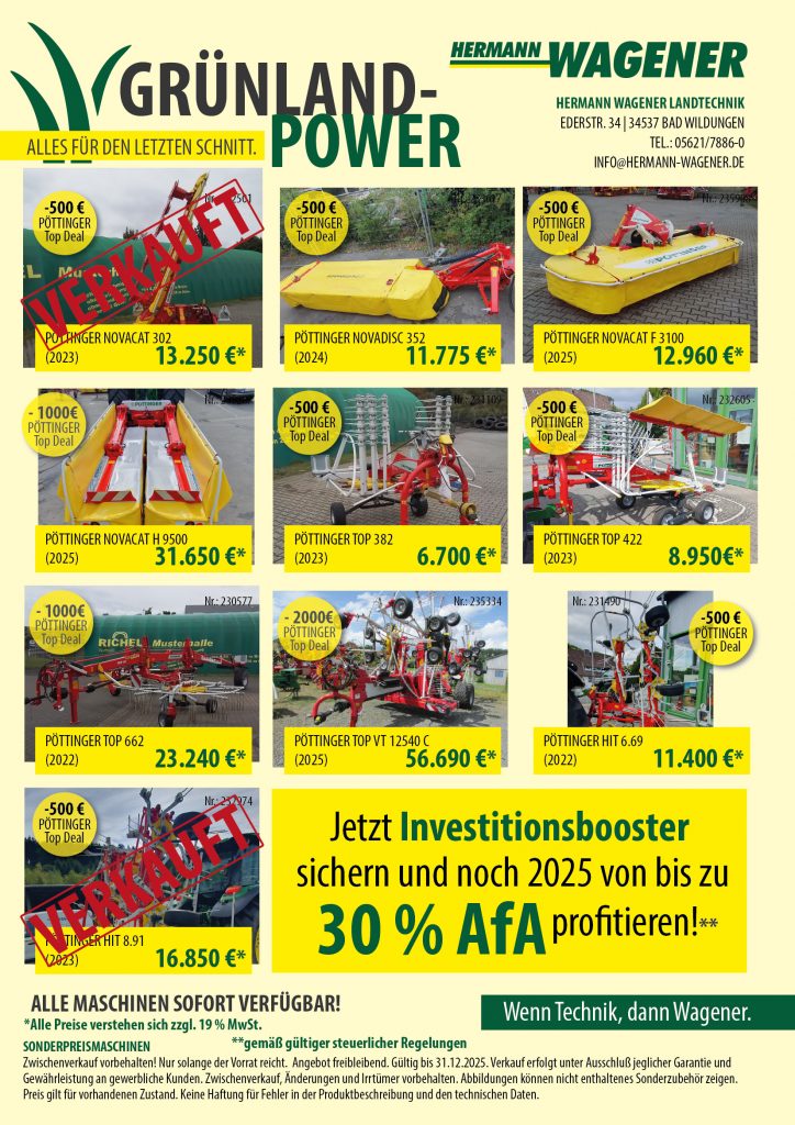 Unser neues Angebotsblättchen hält die besten Maschinen aus dem Pöttinger- und Kuhn-Portfolio bereit – alles, was ihr für den letzten Schnitt benötigt, direkt verfügbar!